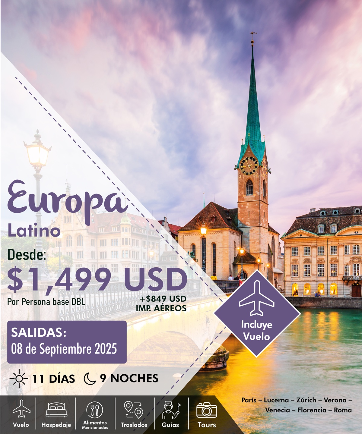 Desayuno. A primera hora de la mañana saldremos hacia el sureste para llegar a la frontera con Suiza. Seguiremos hasta Lucerna, considerada el lugar más turístico del país. La ciudad se encuentra a orillas del Lago de los Cuatro Cantones y el río Reuss, con su conocido Puente de la Capilla. Disfrutaremos de tiempo libre en esta encantadora villa alpina. Más tarde, continuación a Zúrich. Alojamiento.