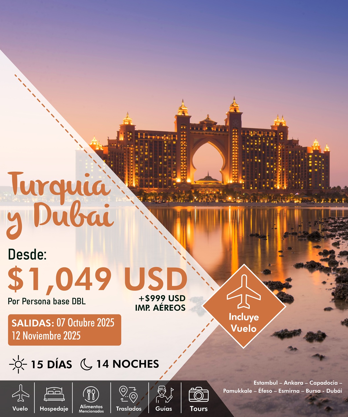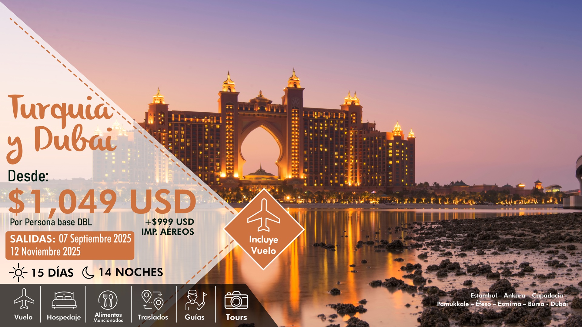 ✓ Boleto de avión México – Estambul – Dubái – Estambul – México en clase turista.