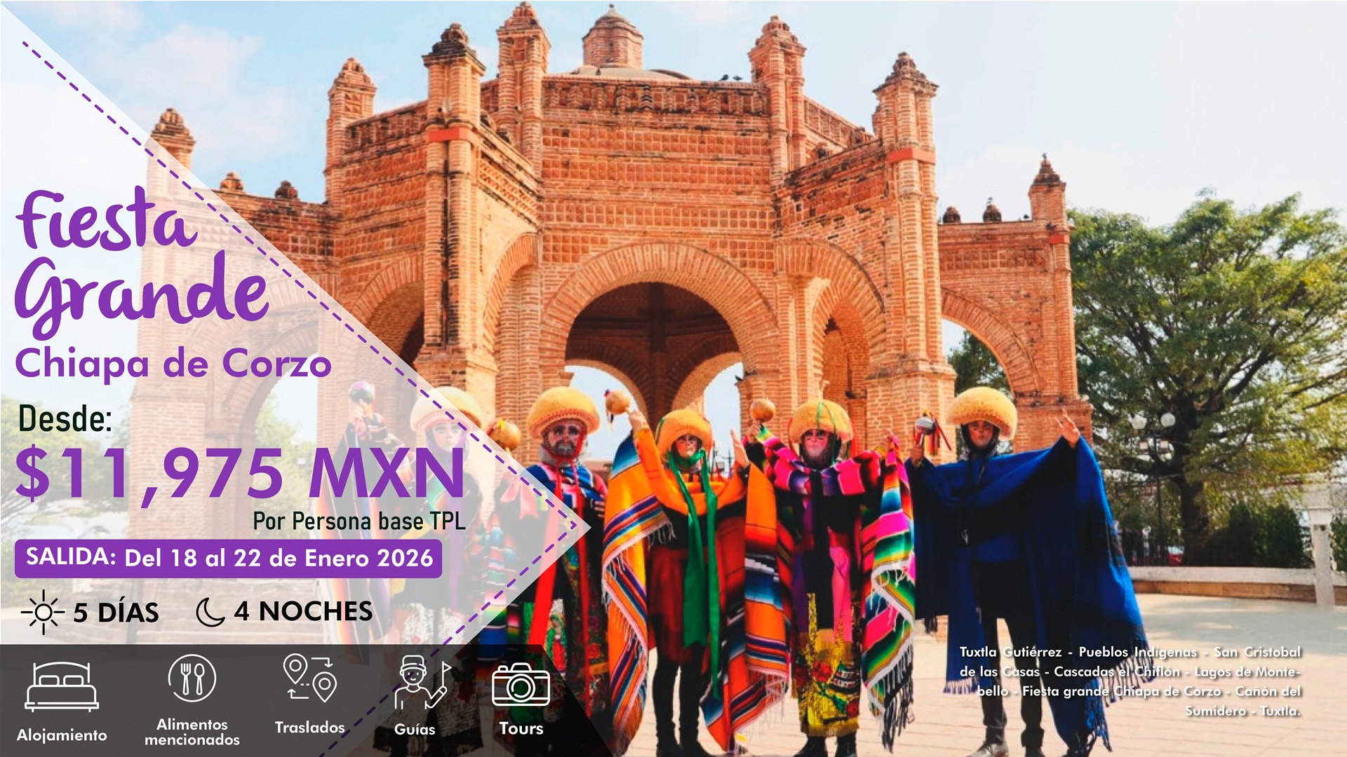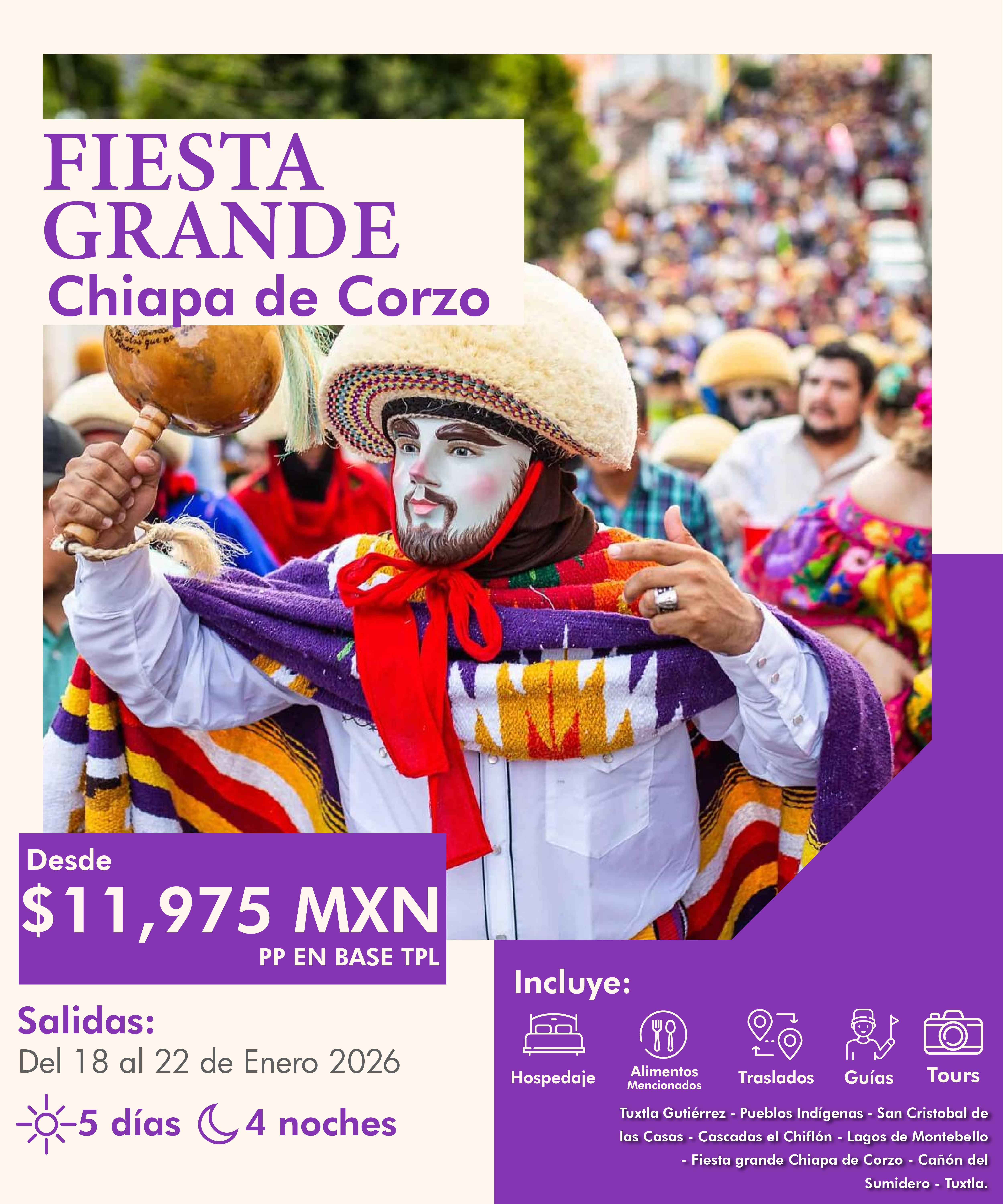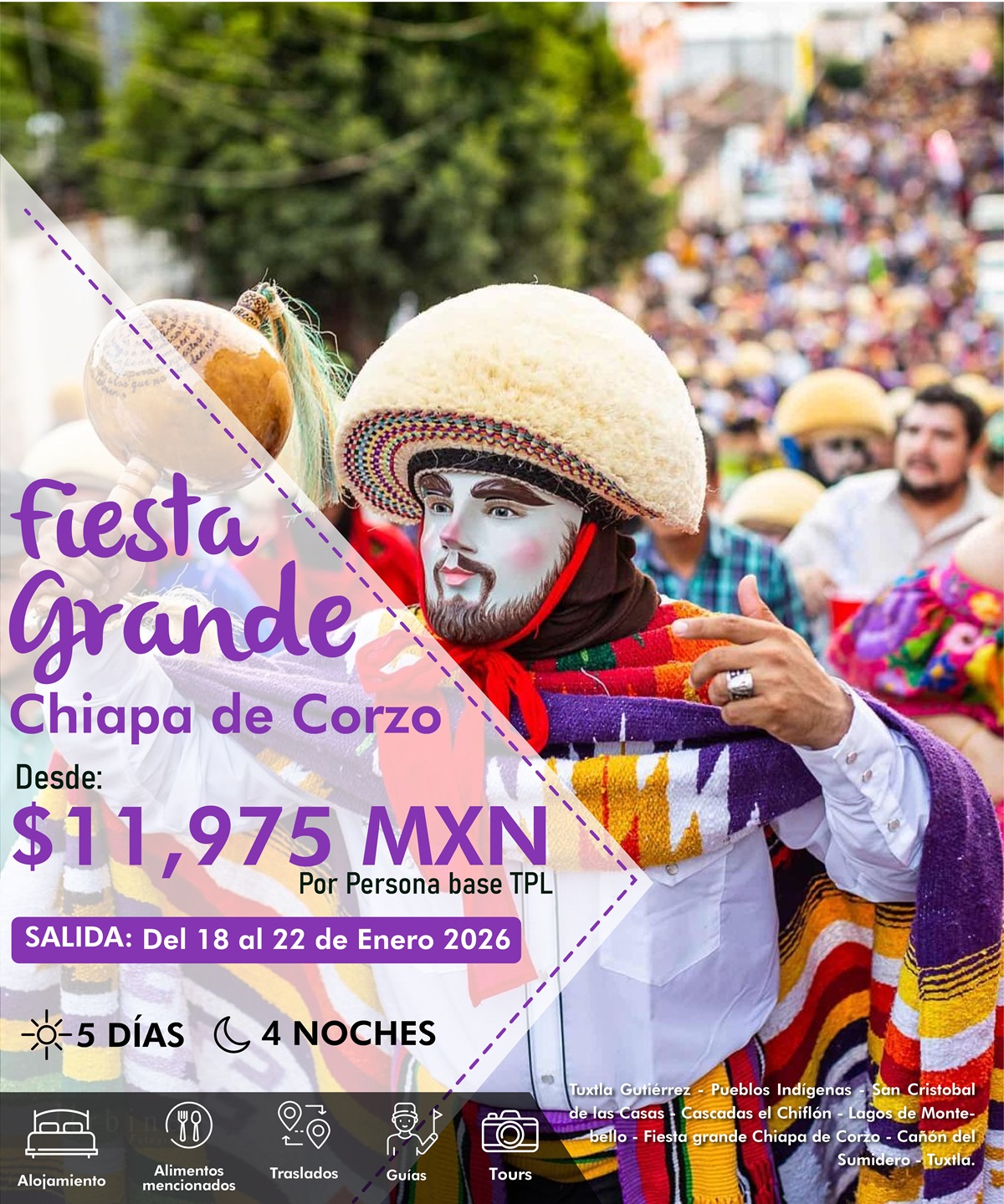 DÍA 3 RECORRIDO DE LOS PARACHICOS Y CHIAPANECAS | Pick up: 12:00 P.M. Regreso al hotel: 09:00 PM (approx.) Alimentos: desayuno americano y comida en el hotel * Salimos al pueblo mágico de Chiapa de Corzo en donde los llevaremos al hotel para hacer el check in, tomar una deliciosa comida típica de la zona incluida, para posteriormente dirigirnos a una experiencia guiada, en donde podremos vivir y ser parte de una de las tradiciones más importantes de todo el Estado de Chiapas, "El Recorrido de Los parachicos y Las Chiapanecas", un festival en donde podremos ver a un sinfín de personas locales vestidas con los traje típicos de Chiapas, un par de bellas prendas coloridas, emblemas del Estado y con un alto valor cultural para todos los locales. * Podremos acompañarlos en su recorrido por las principales calles de la ciudad y ser parte de la misma, por lo que tendremos la oportunidad de caracterizarnos como ellas y de la mano de un guía local, entender todo lo que este festival representa para esta región. |