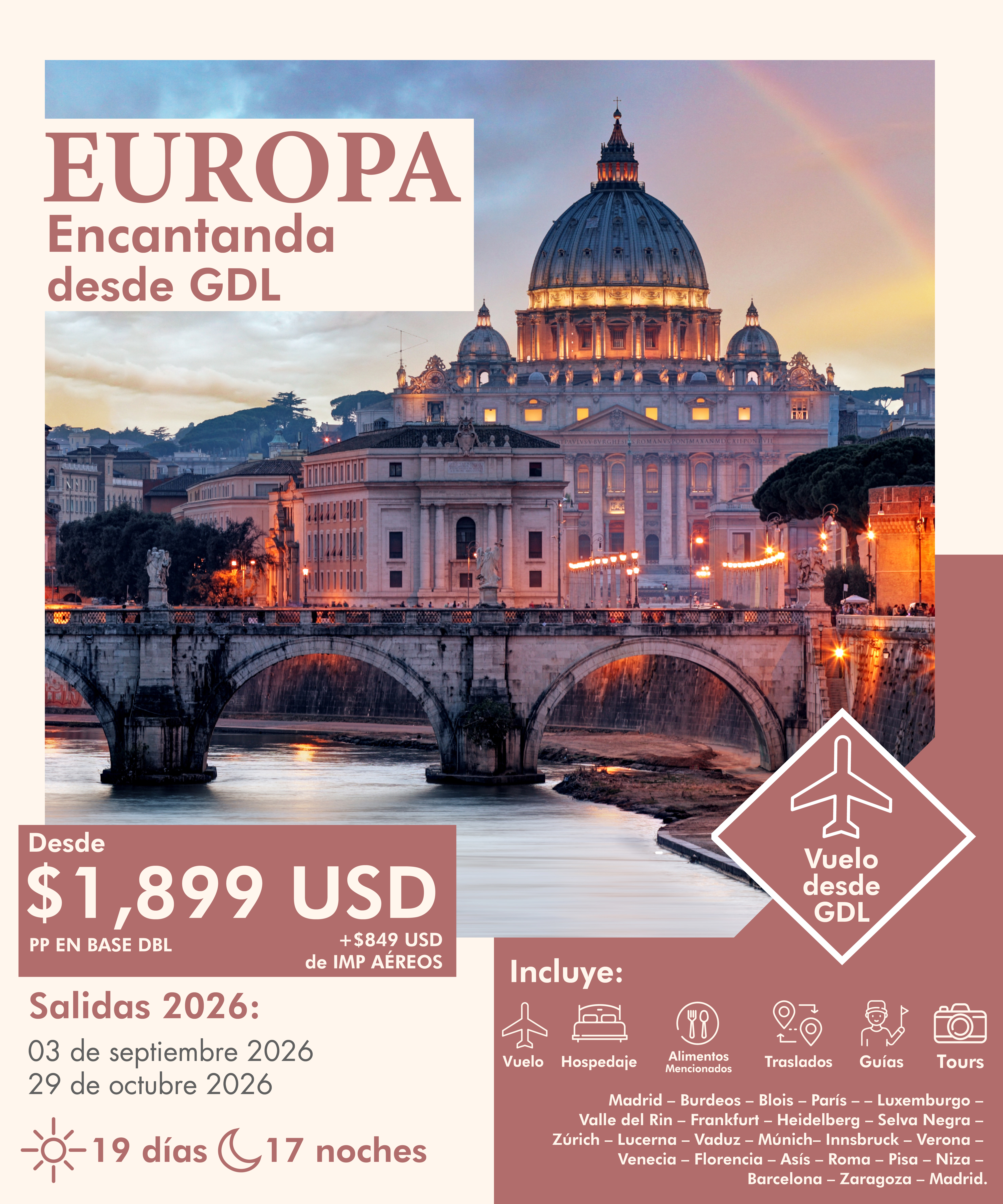 ✓ Boleto de avión Guadalajara – Madrid – Guadalajara volando en clase turista con Aeroméxico.