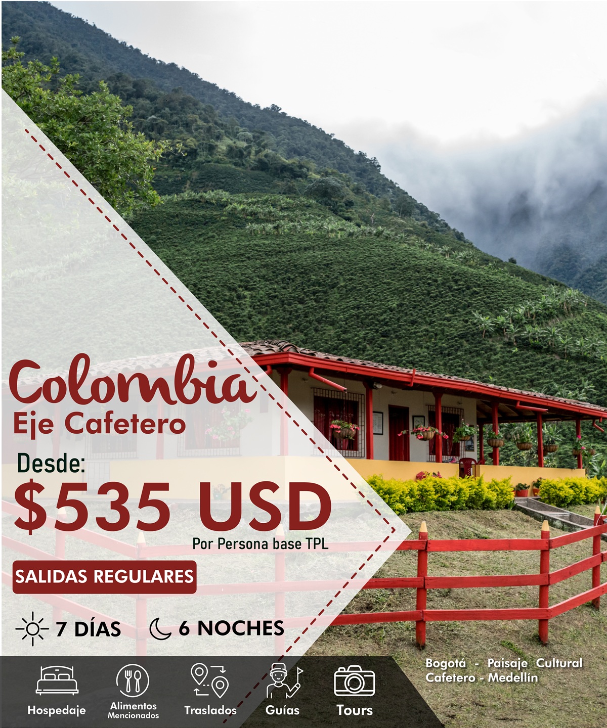 ✓ 2 noches en Bogotá, 2 en El Paisaje Cultural Cafetero (Quindío) y 2 en Medellín en el hotel y plan alimenticio seleccionados.