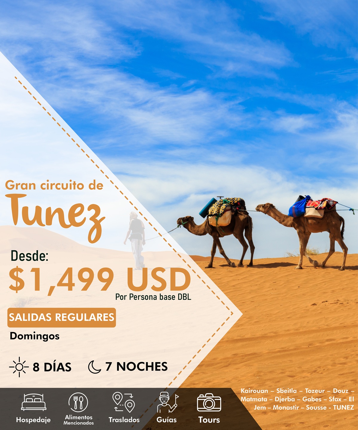 ✓ Visita de Túnez, Tozeur, Douz, Matmata, Djerba, Gabes, Sfax, El Jem y Monastir según itinerario.