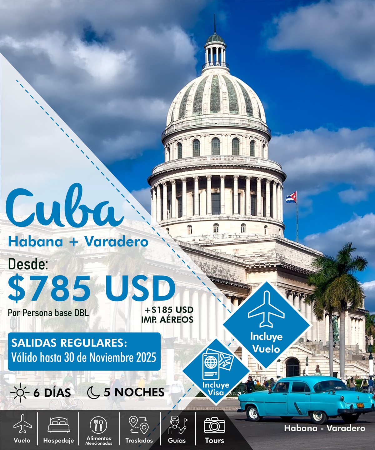 ✓ 2 noches en La Habana con desayunos incluidos;