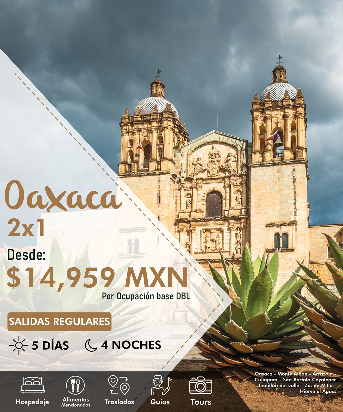 Día 2 Centro de Oaxaca | * Tour de ciudad visitando el centro histórico caminando con su guía, iglesia de santo domingo, corredor turístico, zócalo, catedral, palacio de gobierno mercados 20 de noviembre y Benito Juárez. |