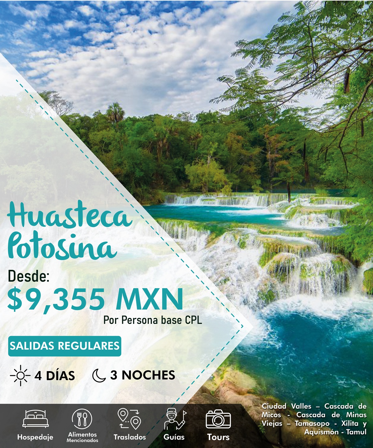 Día 04 Tamul | * Desayuno típico de la región. * Impresiónate con una de las cascadas más altas del estado La cascada de Tamul no sin antes conocer la Cueva del Agua (nacimiento de agua). * El tour finaliza en el hotel u oficinas. El traslado a la central de autobuses es por cuenta del cliente. |