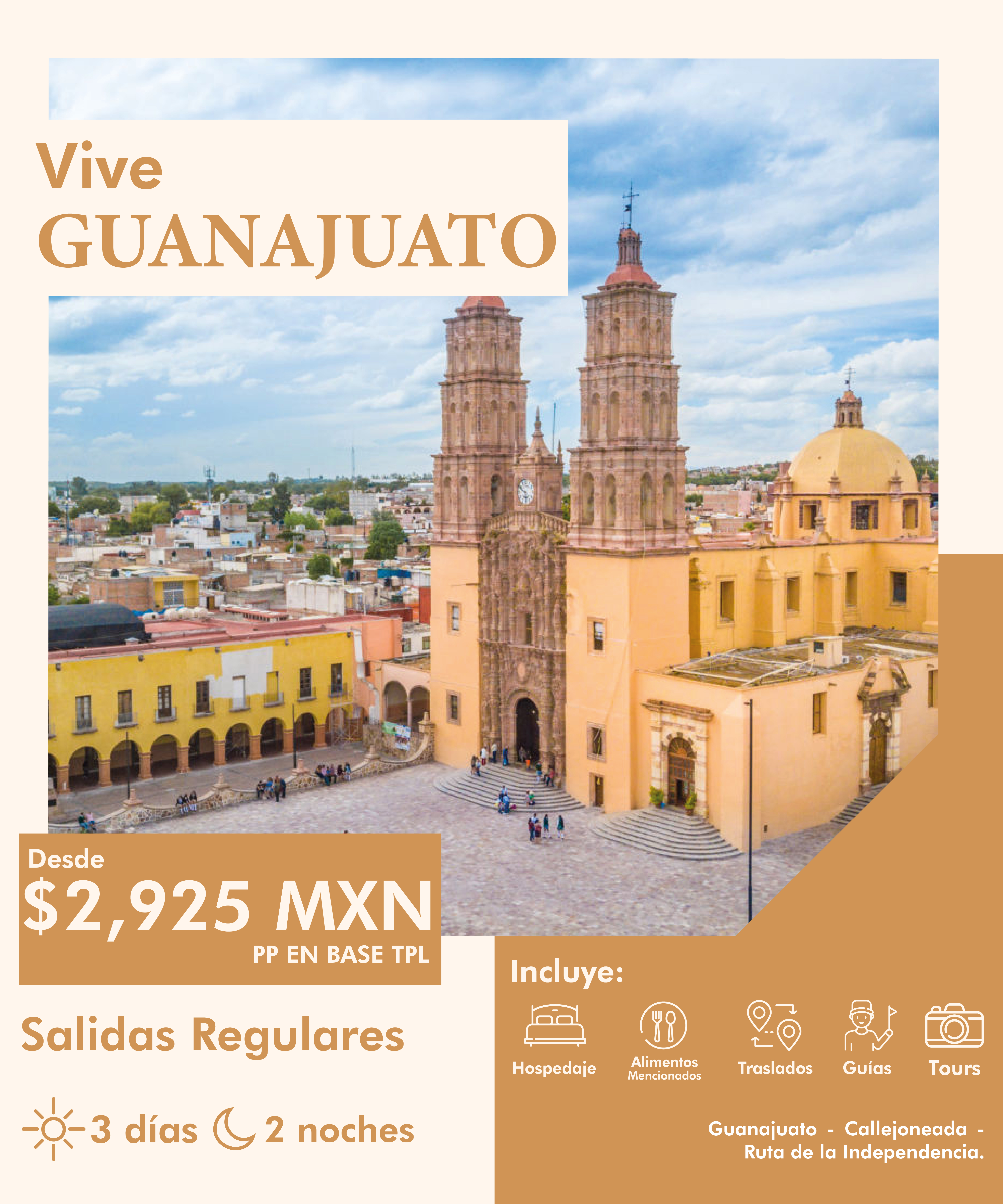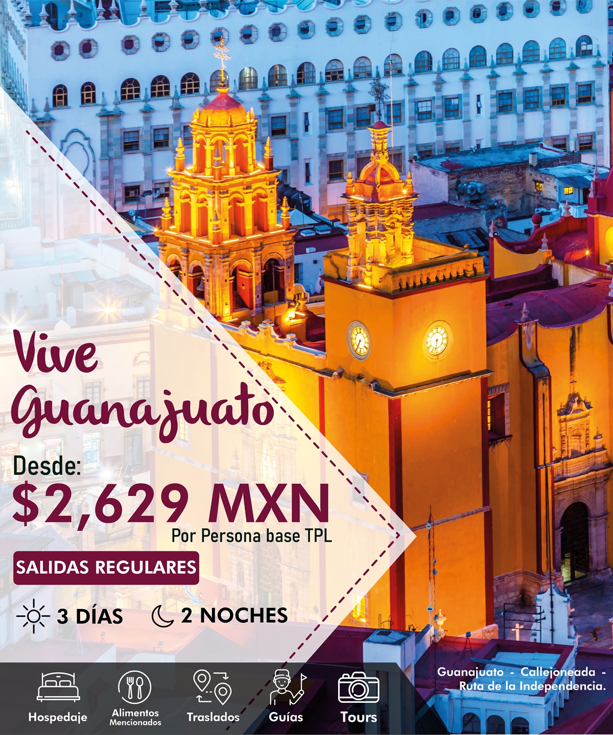 Día 1 CITY TOUR GUANAJUATO Y CALLEJONEADA | * Llegada a Guanajuato. * A la hora prevista nos dirigimos a disfrutar del maravilloso City tour donde conocerás Museo de las momias, Museo de la Santa Inquisición, Mirador del Pípila, Paseo de la presa, Interior de una mina, Paseo panorámico, Pueblo minero de Valenciana, Tienda de cuarzos, Dulcerías. * Por la noche (PUNTO DE ENCUENTRO TEATRO JUAREZ) tendrán una callejoneada ¡A CANTAR! Disfruta entre guitarras, ticordeos, mandolinas una hermosa velada, caminado ter por callejones y plazas. Canta con la estudiantina o mejor conocidos como tunos, personas que bailan y cantan para ti, terminan en el callejón del beso donde les cuentan la leyenda. * Alojamiento en hotel seleccionado. |