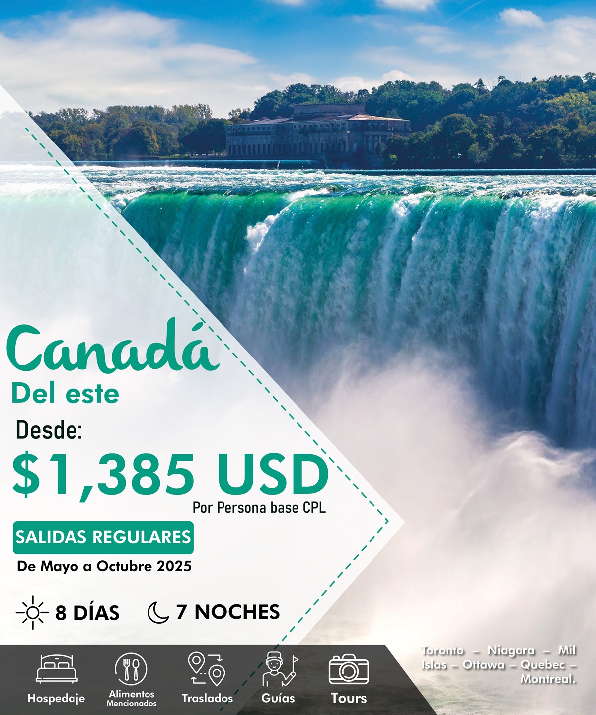 DÍA 3 MIÉRCOLES NIÁGARA -1000 ISLAS -OTTAWA | * Desayuno. Salida temprana por la autorruta Transcanadiense hacia Ottawa. * Excursión de una hora en barco (Incluida) * Continuación hacia la capital del País. Al llegar comenzaremos la visita panorámica, de la ciudad, la Catedral, la residencia del primer ministro, del Gobernador-General. * En el caso que la visita no sea terminada, será completada al día siguiente. * Alojamiento y tiempo libre. |