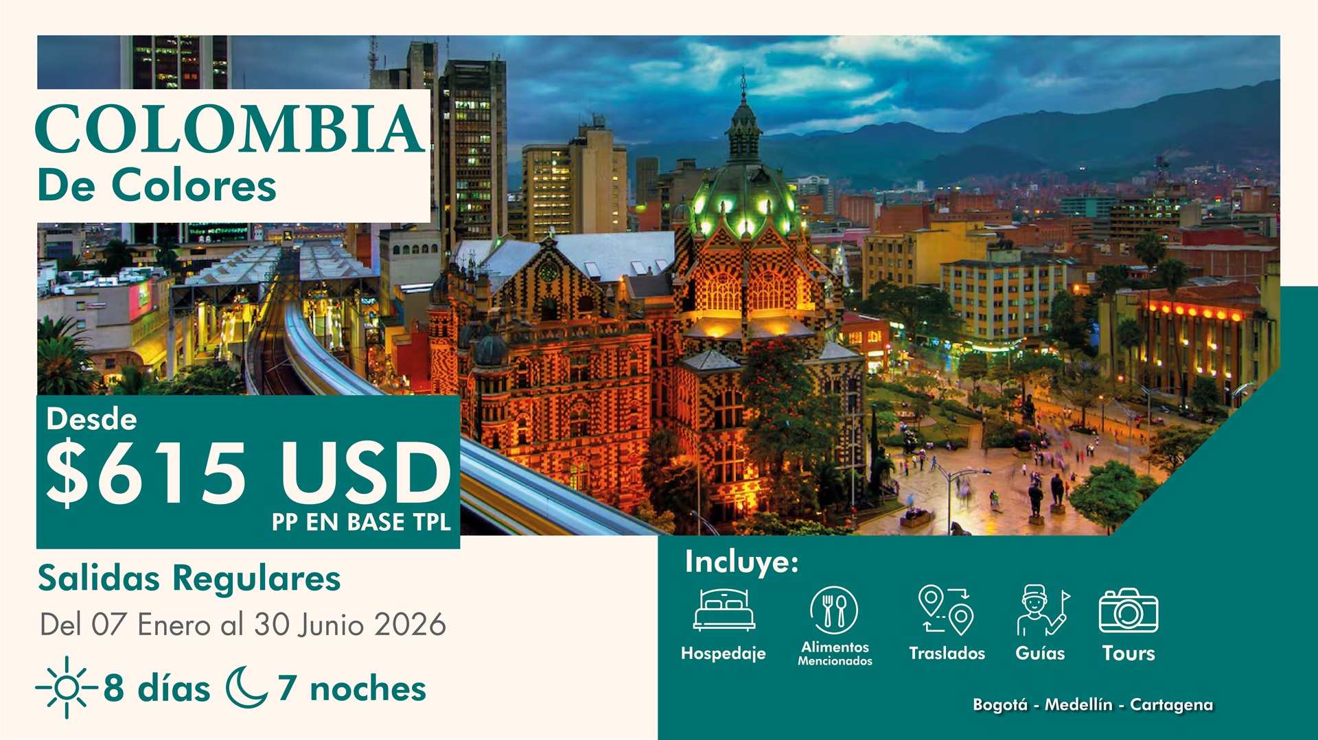 DÍA 4 MEDELLIN | * Desayuno. Tour de Ciudad + Ingreso al Metro y Metrocable (privado). * 5 horas de recorrido panorámico, visitando los sitios de mayor interés en la ciudad. * Recorrido alrededor de El Edificio Inteligente, Plaza Mayor, Parque De Los Pies Descalzos, Centro Administrativo La Alpujarra, Parque de La Luz, Parque Bolívar con su Catedral Metropolitana y Edificio Coltejer, símbolo de la ciudad. * Parada en la Plaza Botero. * Viaje en Metro y Metrocable * Corto recorrido alrededor de la Unidad deportiva Atanasio Girardot y el bulevar de la Carrera 70. * Regreso al Hotel. |