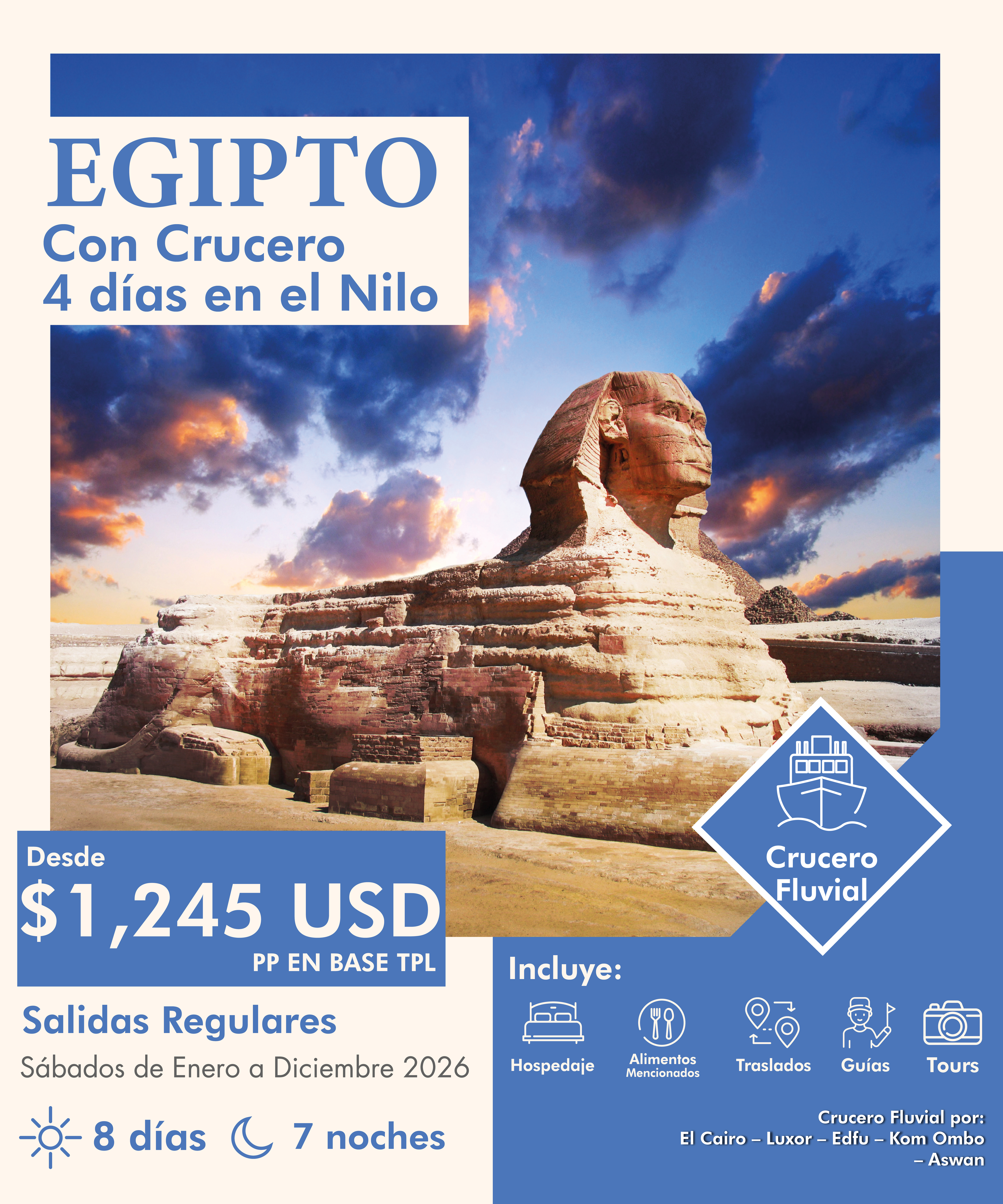 incluida), así como la impresionante Esfinge esculpida en roca. * Resto del día libre. * Regreso al hotel y alojamiento. |