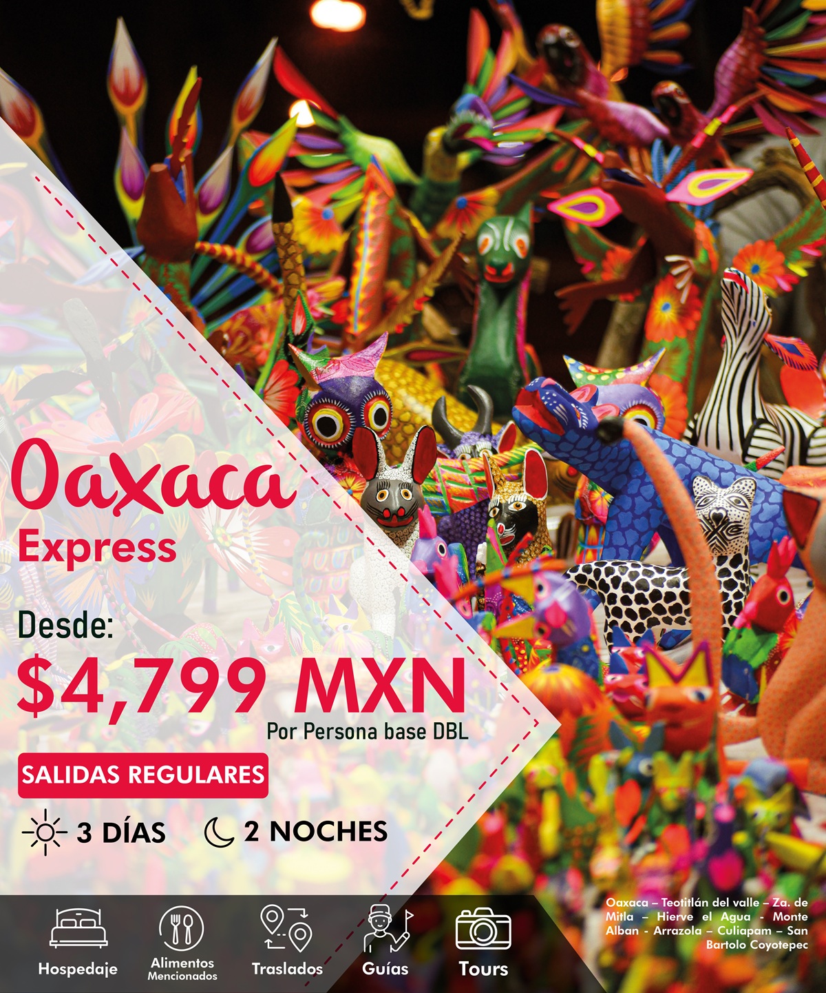 valle, Zona arqueológica de Mitla, fábrica de mezcal y hierve el agua | * Llegada a la ciudad de Oaxaca, recibimiento y traslado al hotel seleccionado, (sugerimos llegada antes de las 08:00am) en caso de no poder, se da el día. * Salida visita al árbol del tule, Teotitlán del valle, zona arqueológica de Mitla, fábrica de mezcal y hierve el agua, regreso a su hotel, comida incluida en tour, sin bebidas. |