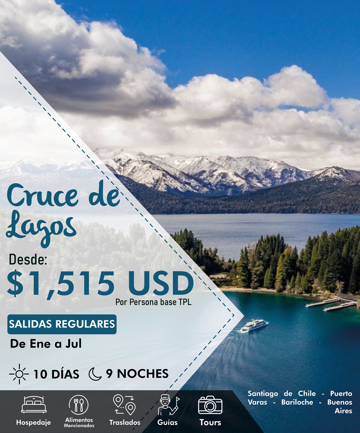 Día 5 Puerto Varas - Cruce Internacional de Lagos | * Desayuno en el hotel. * Ingreso al Parque Nacional Vicente Pérez Rosales. * Llegada a Petrohué. Tiempo libre. Zarparemos hacia Peulla, navegando el Lago Todos los Santos. * Llegada a Peulla, Villa ecológica, paraíso de los amantes de la naturaleza. * Almuerzo opcional. Por la tarde abordaremos un bus con destino Puerto Frías. * Llegada a Puerto Blest, visita a la Cascada Cántaros. * En Puerto Pañuelo, tomaremos un bus para hacer el tramo final con destino a la Ciudad de Bariloche. * Llegada a Bariloche.