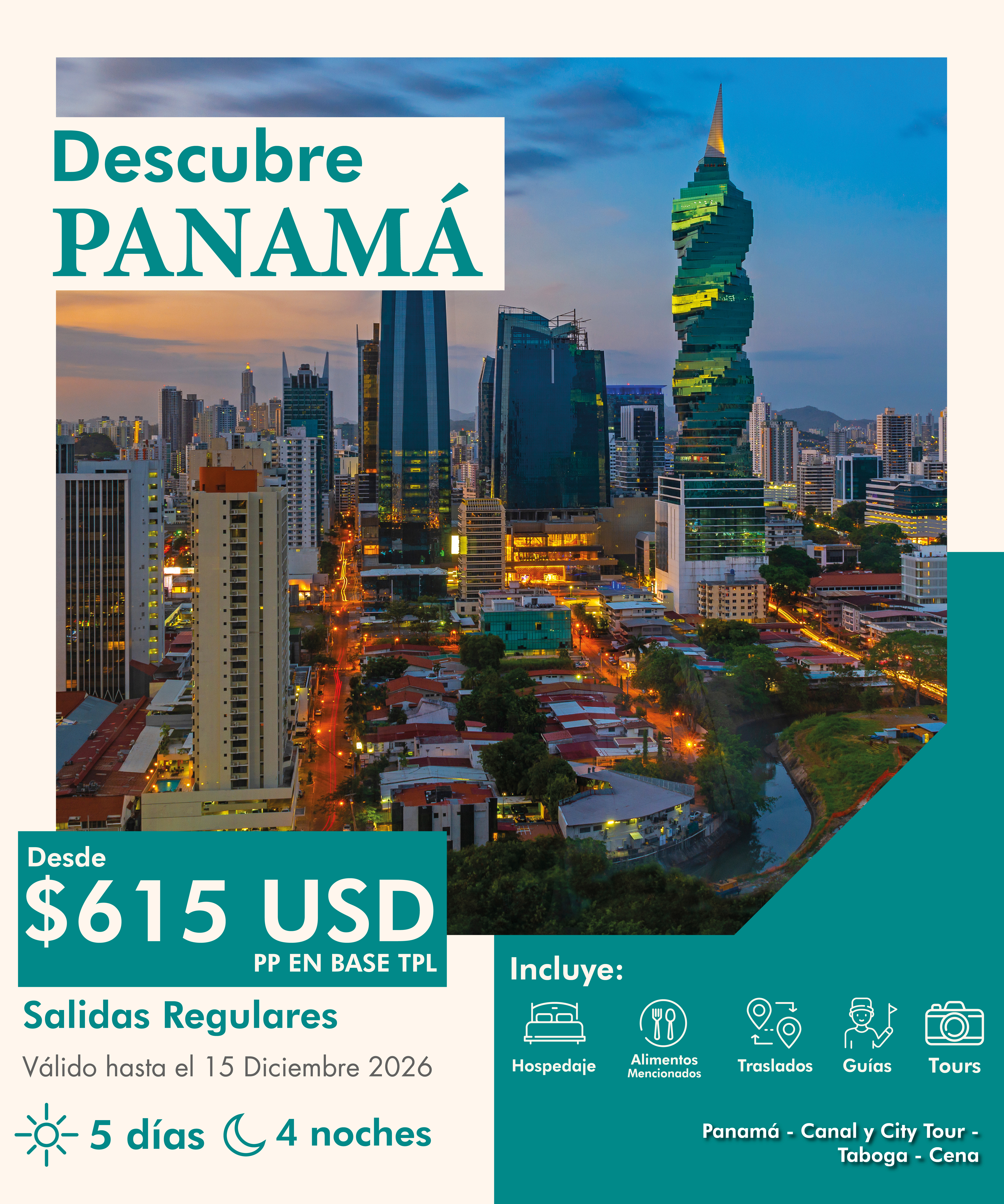 Llegada al aeropuerto internacional Tocumen. Recepción y traslado al hotel seleccionado Check in. 15:00