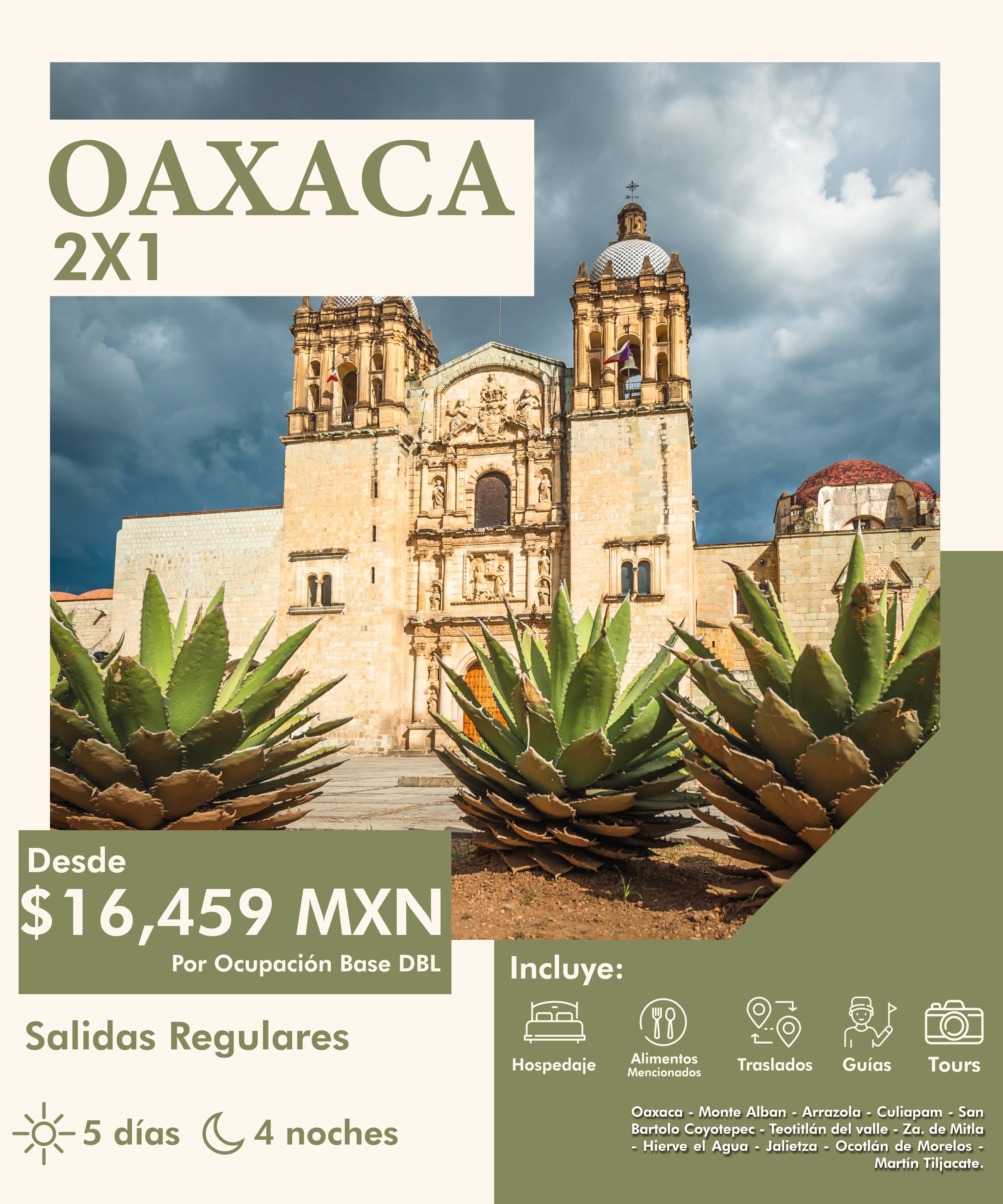 Día 2 Centro de Oaxaca | * Tour de ciudad visitando el centro histórico caminando con su guía, iglesia de santo domingo, corredor turístico, zócalo, catedral, palacio de gobierno mercados 20 de noviembre y Benito Juárez. |