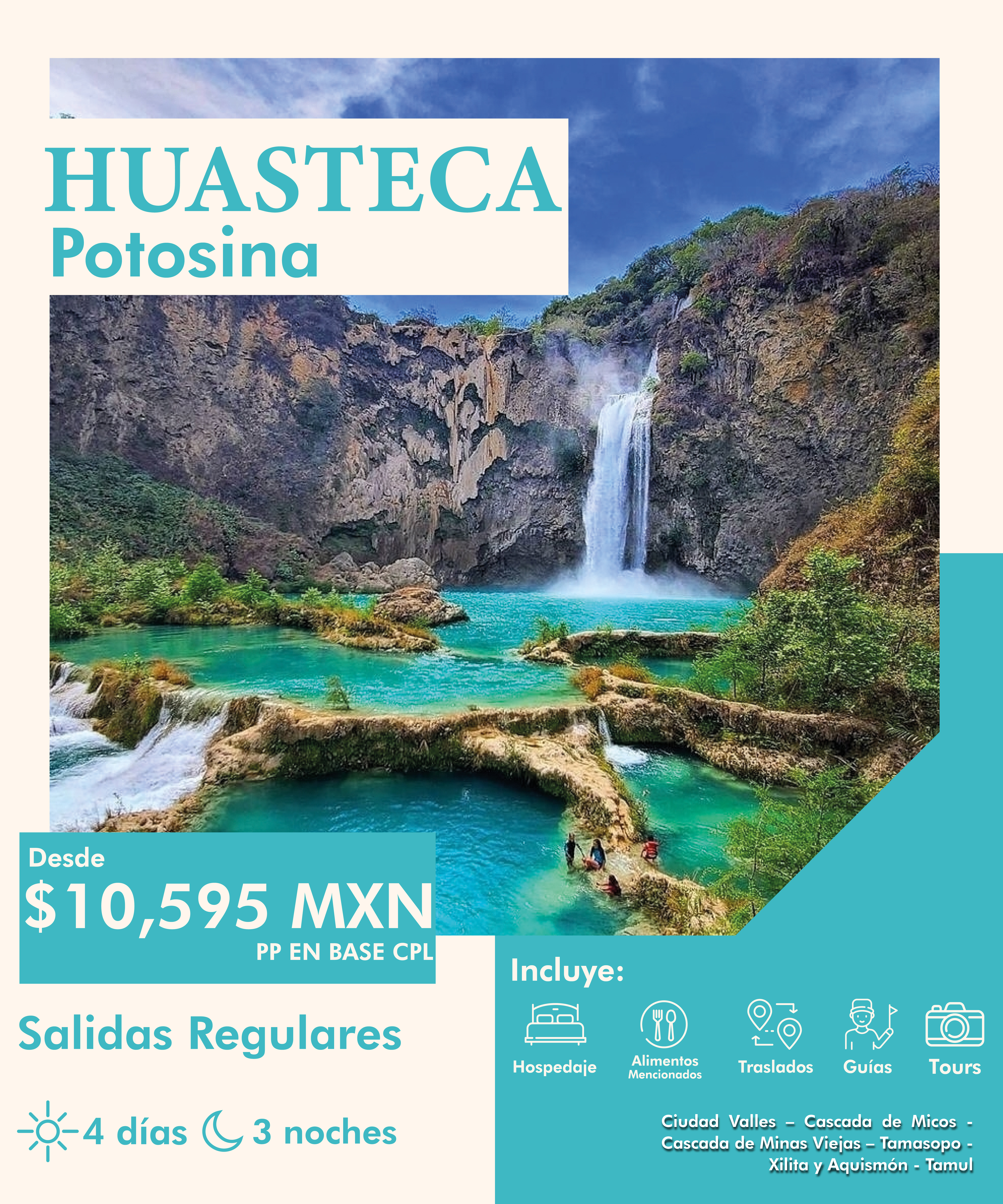 Día 04 Tamul | * Desayuno típico de la región. * Impresiónate con una de las cascadas más altas del estado La cascada de Tamul no sin antes conocer la Cueva del Agua (nacimiento de agua). * El tour finaliza en el hotel u oficinas. El traslado a la central de autobuses es por cuenta del cliente. |