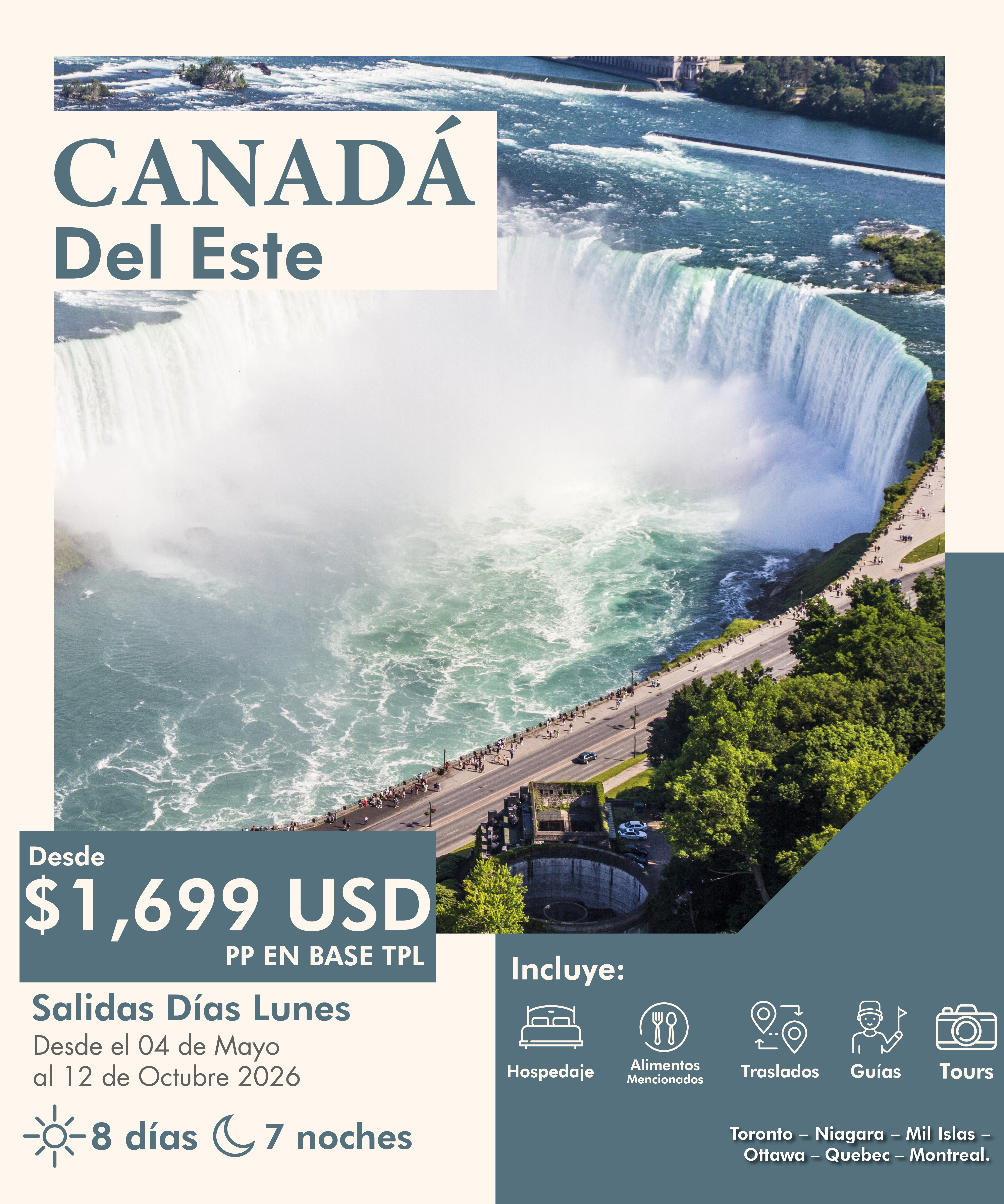 su guía en el lobby y salida para inicio de su viaje * Salida para Niágara-on-the-Lake, llamado el pueblo más bonito de Ontario. * Haremos una parada para recorrer la calle principal. Continuación a Niágara allí nos esperan las majestuosas y famosas cataratas que deslumbrarán con su impresionante caudal de agua. * Almuerzo opcional con costo en Restaurante Skylon con vista a las cataratas. * Llegada a nuestro hotel en Niágara Falls. En su