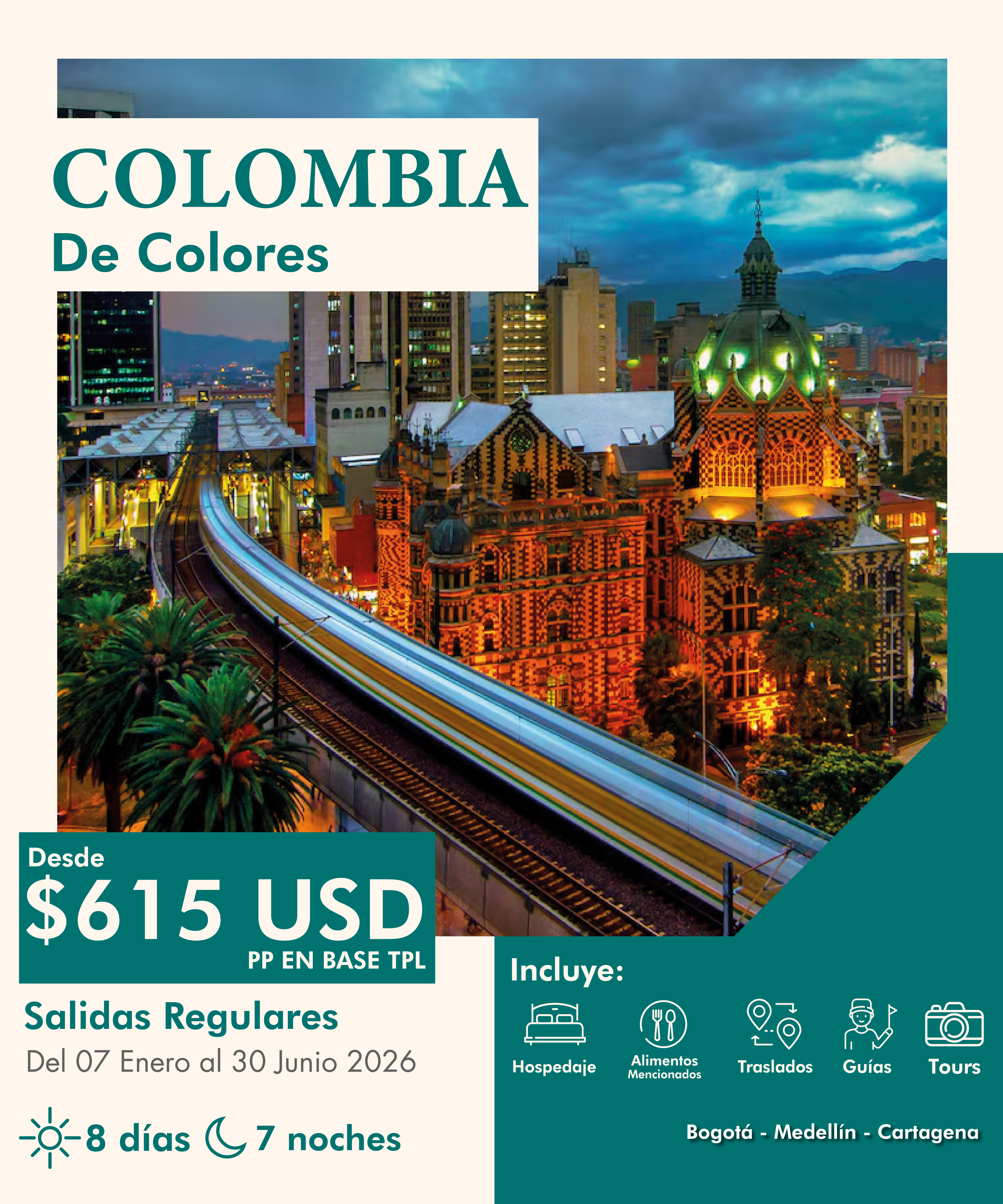 DÍA 4 MEDELLIN | * Desayuno. Tour de Ciudad + Ingreso al Metro y Metrocable (privado). * 5 horas de recorrido panorámico, visitando los sitios de mayor interés en la ciudad. * Recorrido alrededor de El Edificio Inteligente, Plaza Mayor, Parque De Los Pies Descalzos, Centro Administrativo La Alpujarra, Parque de La Luz, Parque Bolívar con su Catedral Metropolitana y Edificio Coltejer, símbolo de la ciudad. * Parada en la Plaza Botero. * Viaje en Metro y Metrocable * Corto recorrido alrededor de la Unidad deportiva Atanasio Girardot y el bulevar de la Carrera 70. * Regreso al Hotel. |
