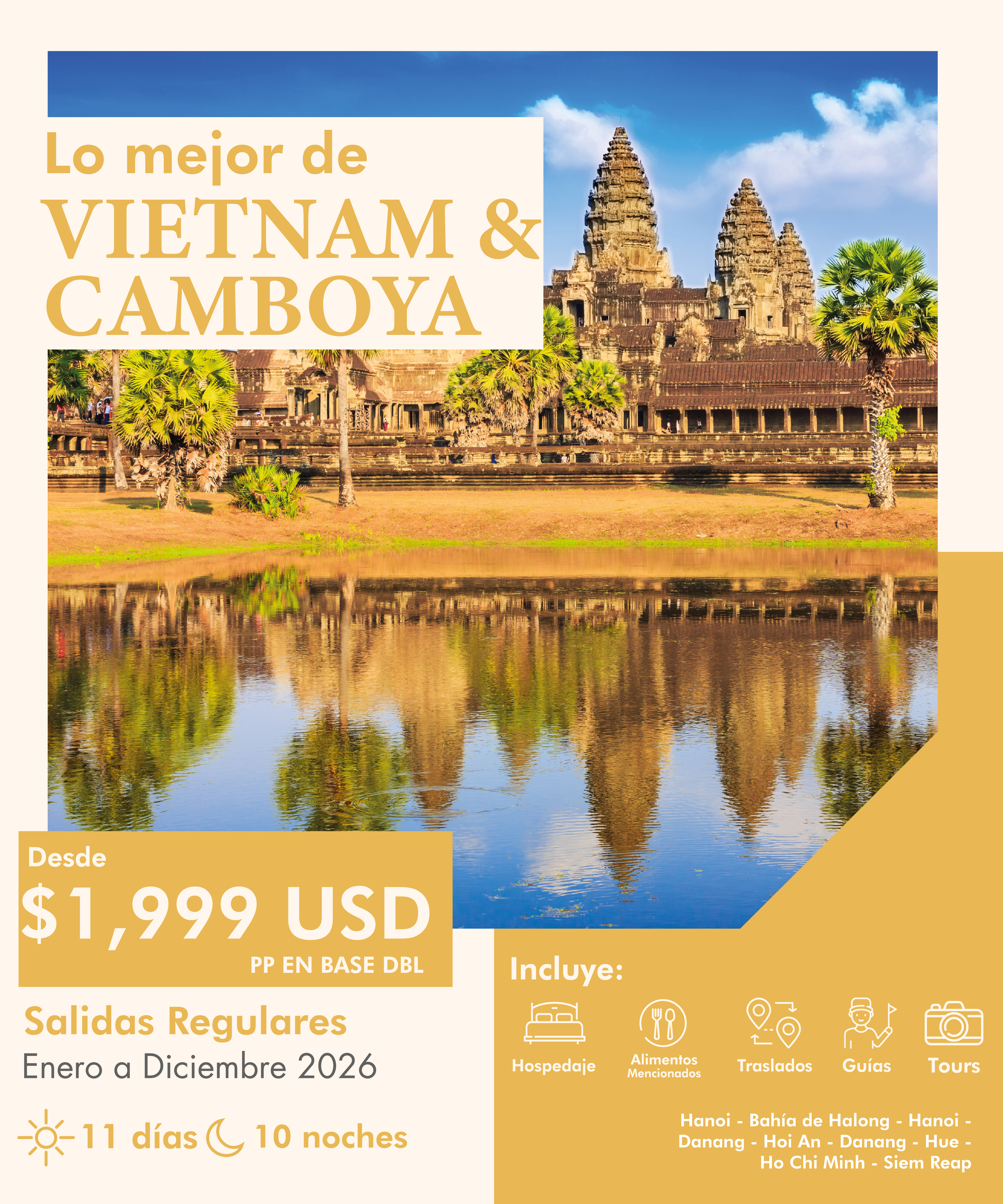 ✓ Guías de habla hispana, excepto en el crucero por la bahía de Halong, donde serán atendidos por la tripulación.